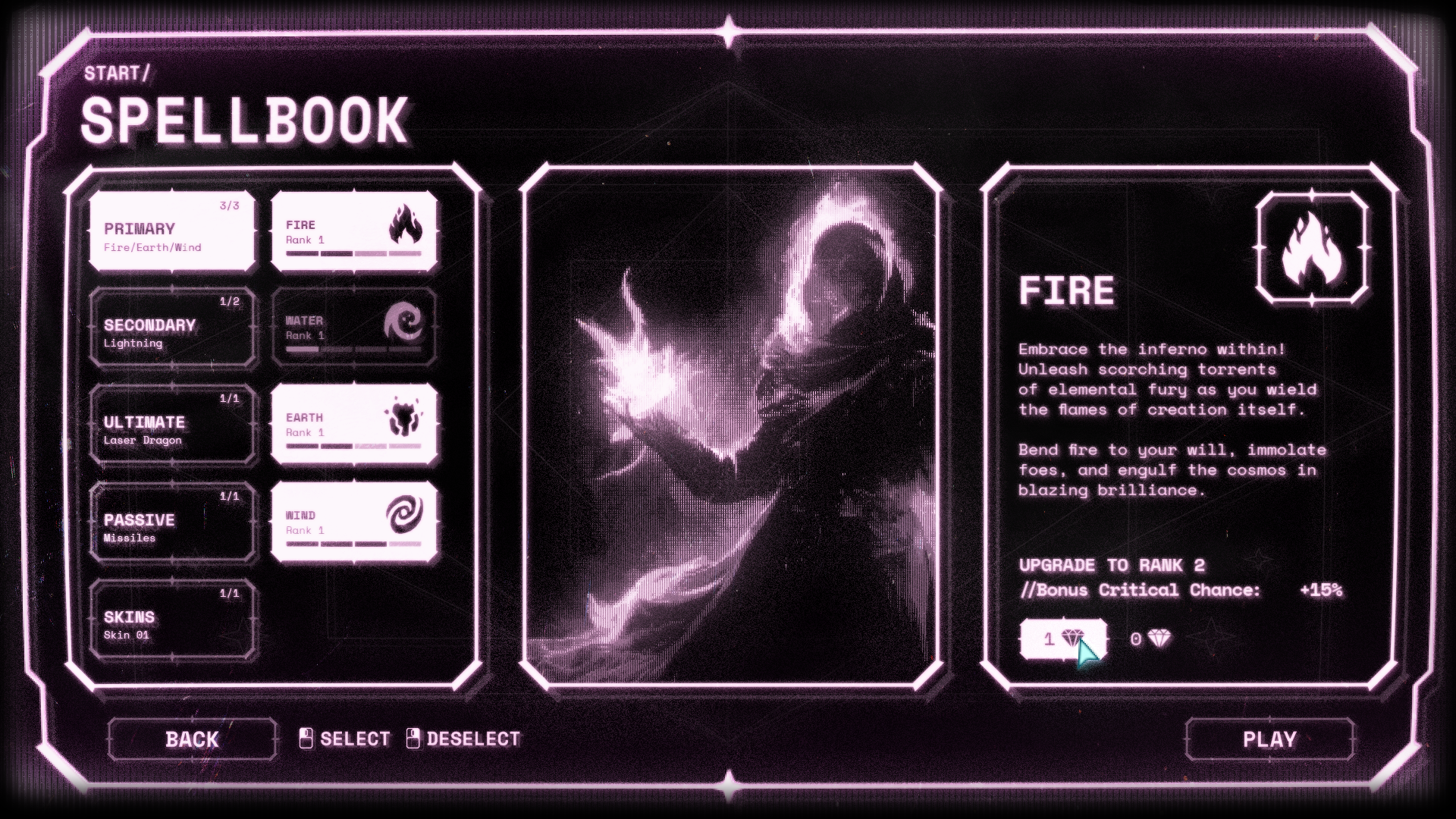 The spellbook contains everything you need to customise your character before begining a new run. Some options depend on what you have completed playing Astromage, be it through exploration or unlockables. Your options are: