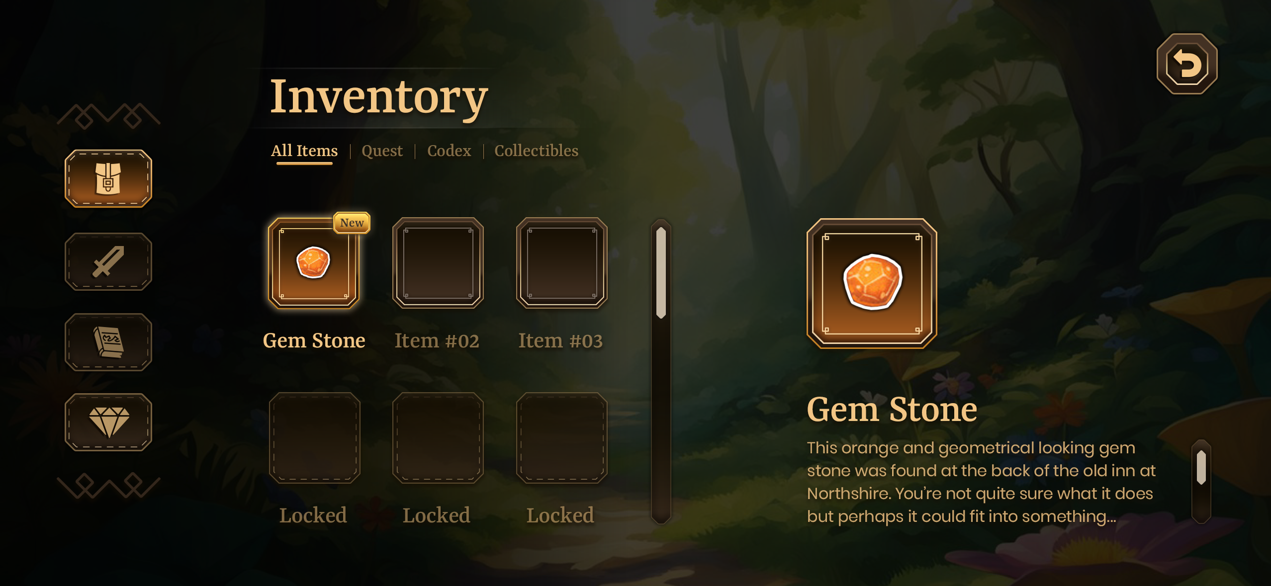 Inventory screen, with an item selected (including its description). Some items may be used for puzzles as shown above.