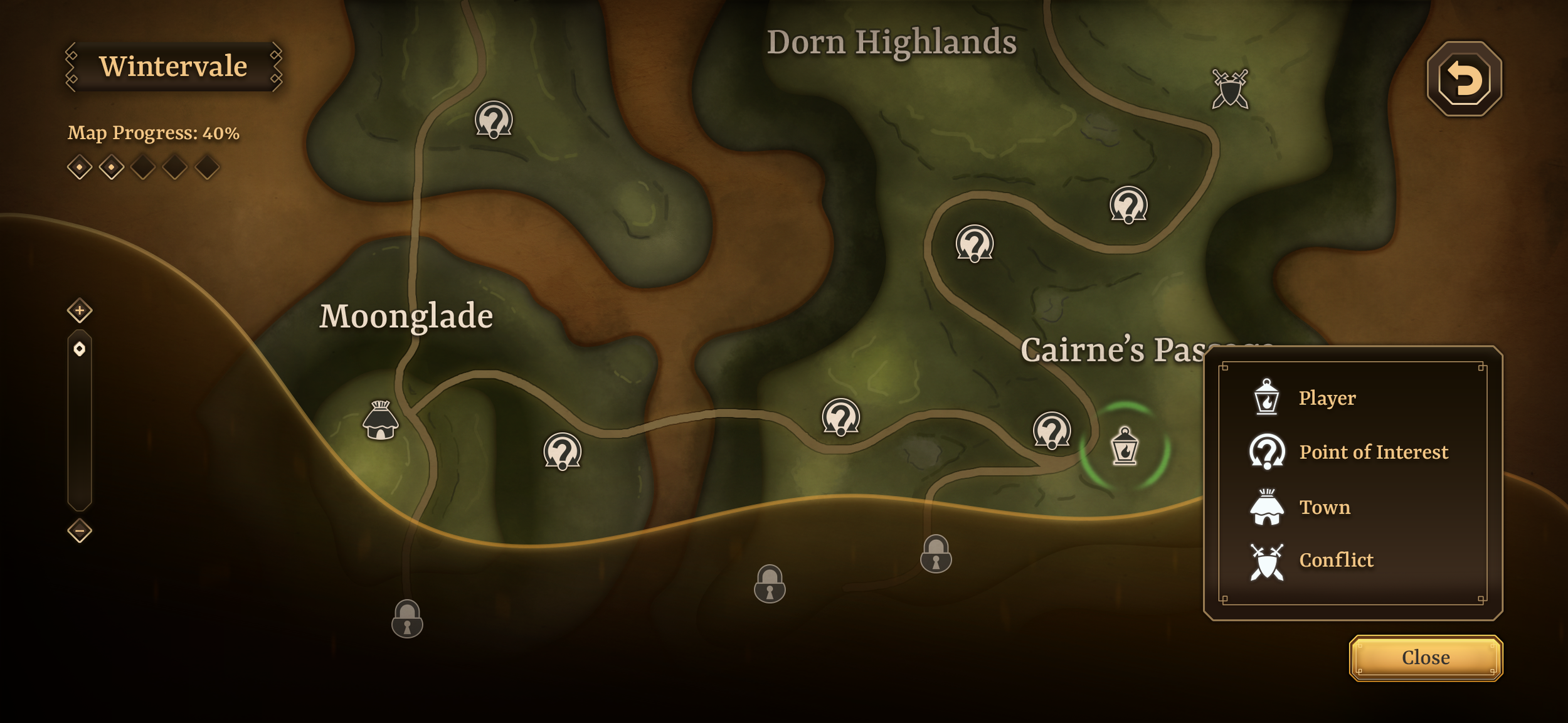 Map containing explored vs unexplored areas (fog of war). Legend on the right to explain what the icons refer to.